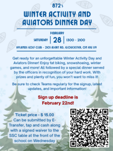872 staff have planned a day that will begin with a morning of fun outdoor activities, followed by an Aviator’s Dinner, a special dinner served by officers in recognition of our cadets hard work.
